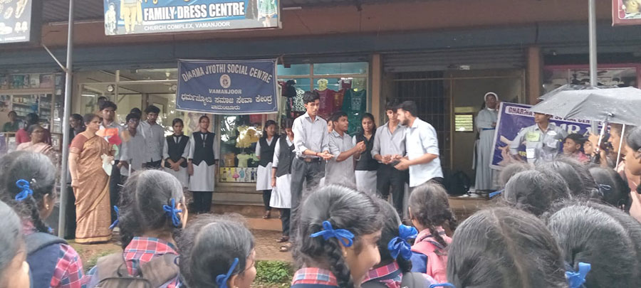 Dharma Jyothi Social Centre, Vamanjoor supported by Arise Foundation in collaboration with School of Social Work, RoshniNilaya organized an Anti drug awareness against drug abuse on 29th September, 2023 at 3 locations in Vamanjoor - St. Raymond’s College, Vamanjoor Church Street and St. Joseph’s Engineering College. The impact message of “Drug Free Mangalore” was effectively conveyed through Compelling Street Play led by Professor Vineetha K. and students of RoshniNilaya. This Initiative aims to promote a drug free and healthier community. 300 students from Raymond’s College, 1500 students from St. Joseph’s Engineering College and 200 people participated in this programme.